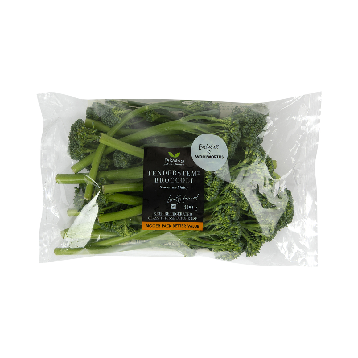 Our Tenderstem® Broccoli has long, tender & juicy stems with a delicate flavour. HOW TO USE. Cooking instructions as per packaging. Perfect to roast, saute or steam. THIS PRODUCT. 400 g. Class 1. Locally farmed. Rinse before use. Keep refrigerated. Exclusive to Woolworths. Bigger pack better value. OUR DIFFERENCE. It's fresher for longer:. Only the best is good enough: . Our farmers are quality:. We're farming with tomorrow in mind:. DISCLAIMER. Although the greatest care has been taken to ensure the accuracy of product information on our website/ APP, product recipes and ingredients change from time to time. Therefore, it is recommended that this information is used as a guideline only and that product labels are read with care.