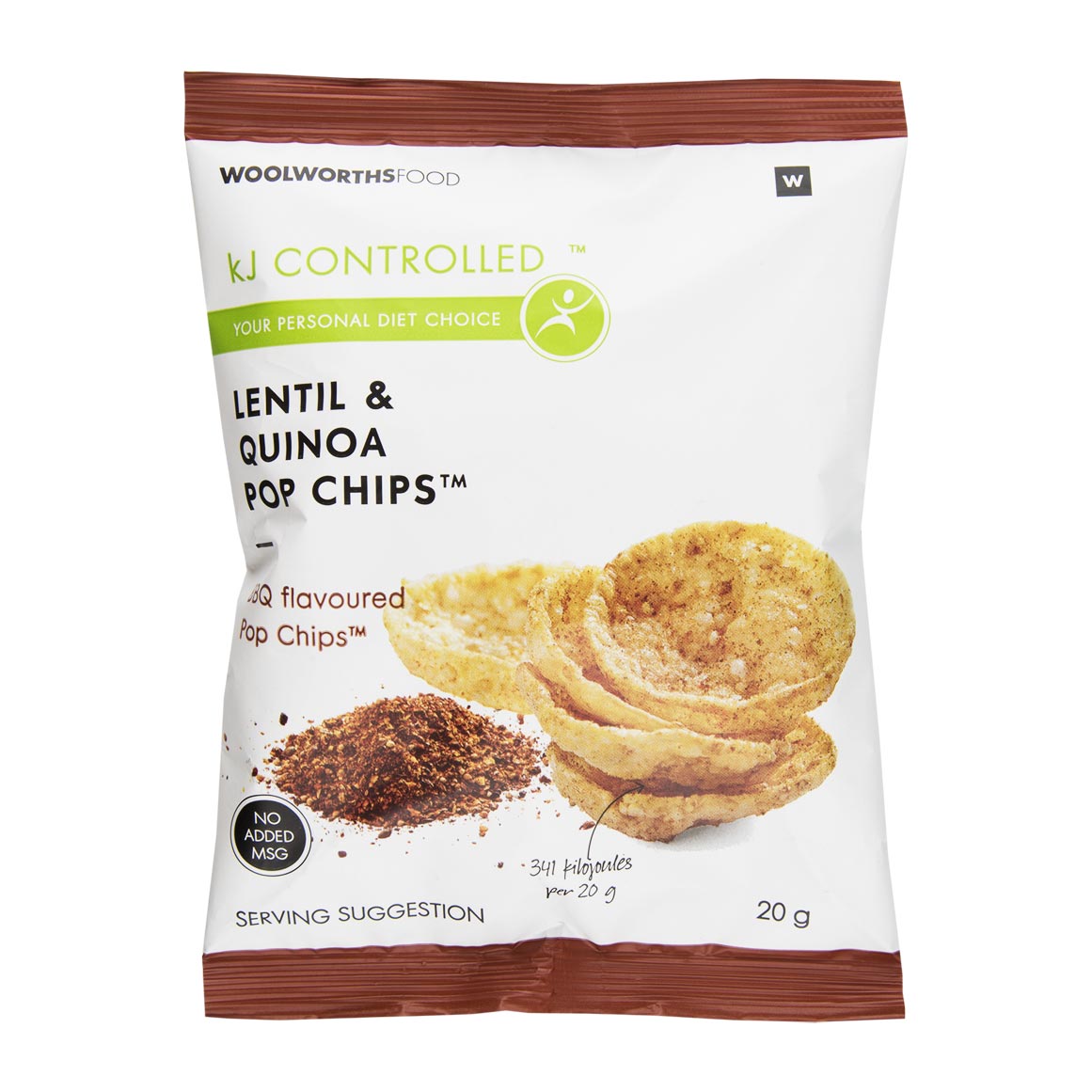 Our Lentil & Quinoa BBQ Flavoured POP CHIPS™ are made with a mix of quinoa, lentil, and other flours. Pressure and heat are applied to this mix to pop it into a light and crispy chip. THIS PRODUCT. 20 g. No added MSG. 341 kJ per 20g. Vegetarian with milk. Halaal. Kosher. POP CHIPS™. kJ CONTROLLED™.