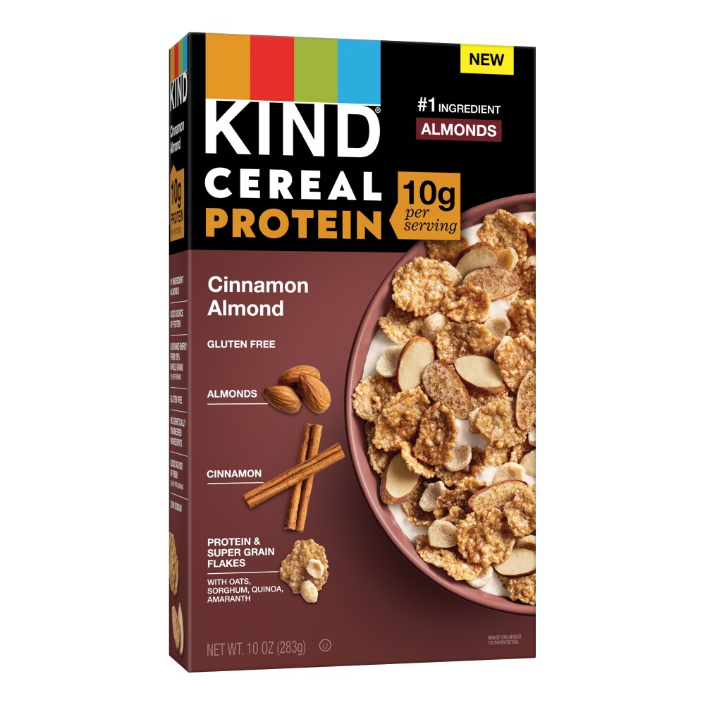 KIND® Cinnamon Almond Protein Cereal delivers delicious nutrition that raises the standard of cereal. #1 ingredient is almondsProtein & super grain flakesCinnamonGluten free.