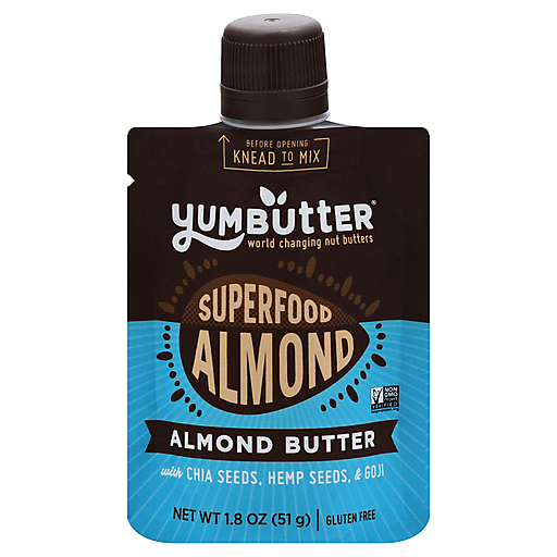 Almond butter with chia seeds, hemp seeds, & goji. Gluten free. Certified Gluten-free. Carefully produced in gluten-free facility. Certified vegan. vegan.org. Non GMO Project verified. nongmoproject.org. World changing nut butters. Go-anywhere pouch! Take me with you to work, school, travel, or any other amazing place for deliciously healthy snacking. Squeeze some goodness on. Eat good, fuel food. Much love, Team Yumbutter. yumbutter.com. Learn more about our mission at yumbutter.com. Certified B Corporation. This pouch is not recyclable. We're sorry. Working on it.