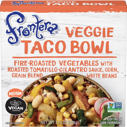 Fire-roasted vegetables, roasted tomatillo-cilantro sauce, grain blend, white beans and corn. Medium. Vegan. New. Gourmet Mexican cuisine from Chef Rick Bayless. In Mexico, cooks have always tucked roasted vegetables into tacos. Mixing our unique veggie blend with zesty green chile sauce and bright cilantro makes it Frontera worthy. From the kitchen of Rick Bayless, award-winning chef, author, and television cooking show host. SmartLabel.