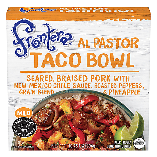 Seared braised pork with new mexico chile sauce, roasted peppers grain blend & pineapple. Pork raised without antibiotics. Spit - roasted, red chile marinated pork tacos topped with pinapple are a legendary part of late night taco crawls in Mexico City. We've captured those same bright flavors, for everyday. Salud. Gourmet Mexican cuisine from Chef Rick Bayless, Award-Winning Chef, Author, & Cooking Show Host. US inspected for wholesomeness by Department of Agriculture. fronterafoods.com. how2recycle.info.