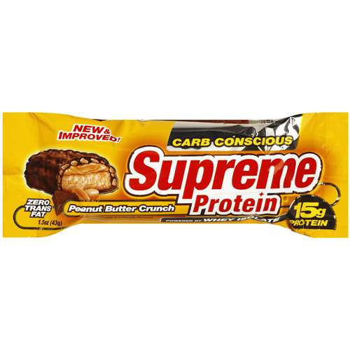 Naturally & artificially flavored. Powered by whey isolate - primary source. Delicious candy bar taste. Rich chocolate & peanuts butter. 15 grams of high-quality protein. With essential vitamins & minerals. Superior nutrition and award-winning taste! Delicious quadruple layer candy bar taste. Now you can have it all with Supreme Protein. The world's first quadruple layer protein bar combines real candy flavor and the unsurpassed amino-rich power of high-performance protein bar that not only tastes great but helps to deliver the quality nutrition you need to achieve serious results from your training program. In addition, the Supreme Protein Peanut Butter Crunch bar also provides essential vitamins, minerals and crunchy protein crisps. Try this nutritional masterpiece for yourself and you'll agree - superior nutrition has never tasted this good! Gold Superior Taste by American Masters of Taste.