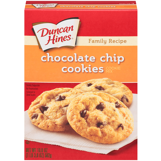 - The product category for Duncan Hines, Family Recipe, Chocolate Chip Cookie Mix, Chocolate Chip, Chocolate Chip is Cookies.