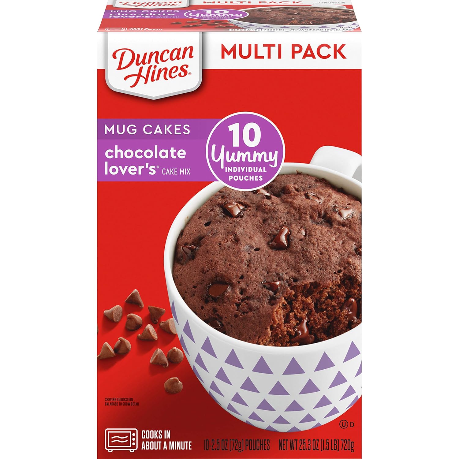 Treat yourself to a single serving of decadence with Duncan Hines Mug Cakes Chocolate Lover's Cake Mix. Rich and moist, this warm chocolate cake is ready in minutes to delight the chocolate lover in you. Savor this individual serving cake as a weeknight indulgence or as chocolate dessert on date night. Just add three tablespoons of water or milk to an individual pouch of chocolate cake mix in a microwavable mug, microwave on high for 1 minute and 10 seconds and let cool. The simple prep means you can enjoy this microwave cake quickly. From warm mug cake mix to signature cakes, Duncan Hines has you covered when you’re ready to bake and create.