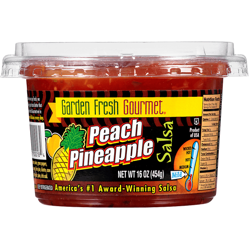 Tomatoes, Onions, Green Peppers, Pineapple, Peaches, Jalapenos, Vinegar, Lime Juice, Cilantro, Cane Sugar, Dehydrated Celery, Salt, Fresh Garlic, Spices, Citric Acid.