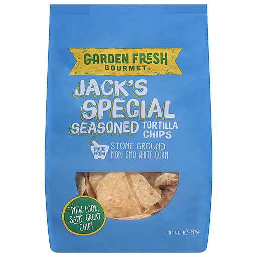 Garden Fresh Gourmet® Tortilla Chips Jack's Special Seasoned. New look, same great taste. No artificial preservatives. Net Wt. 14 oz (397 g).