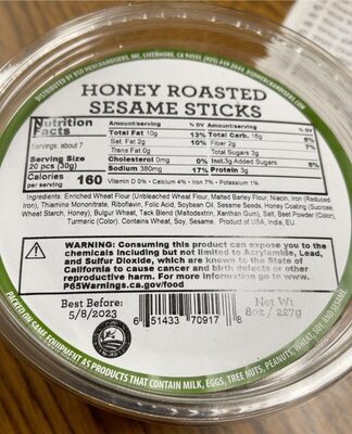 - The country of origin for Honey Roasted Sesame Sticks, Honey Roasted Sesame is United States.