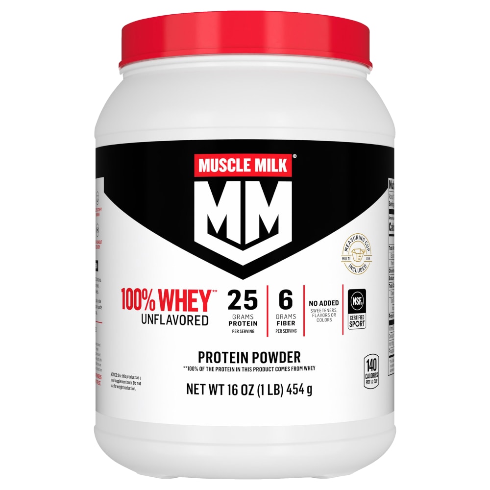 100% whey (100% of the protein in this product comes from whey). Measuring cup included. Multi use. Great for baking. Mixes easily. Helps satisfy hunger. Energizing. Helps build muscle. Post workout recovery. The science behind protein. Muscle milk 100% whey unflavored contains a blend of high-quality whey protein isolate and concentrate to help increase amino acid levels. Essential amino acids, including leucine, play a role in muscle growth. Protein also helps support muscle rebuilding and maintenance of muscle mass. Muscle milk protein powders offer quality you can trust. Muscle milk. Own your strength. The power of 100% whey unflavored. Please recycle.