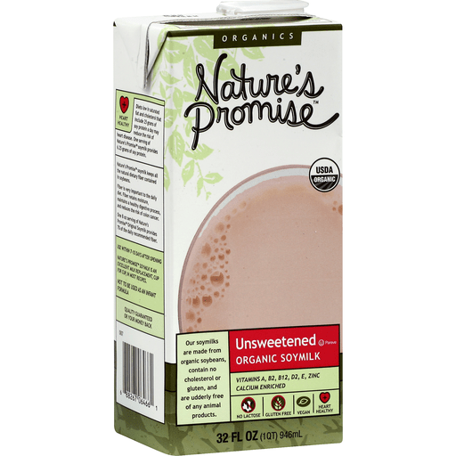USDA Organic. Certified organic by Quality Assurance International. Our soymilks are made from organic soybeans, contain no cholesterol or gluten, and are udderly free of any animal products. Vitamins A, B2, B12, D2, E, Zinc. Calcium enriched. No lactose, gluten-free, vegan, heart healthy. Diets low in saturated fat and cholesterol that include 25 grams of soy protein a day may reduce the risk of heart disease. One serving of Nature's Promise soymilk provides 6.25 grams of soy protein. Nature's Promise soymilk keeps all the natural dietary fiber contained in soybeans. Fiber is very important to the daily diet. Fiber retains moisture, maintains a healthy digestive process, and reduces the risk of colon cancer. One 8 oz serving of Nature's Promise Original Soymilk provides 7% of the daily recommended fiber. Nature's Promise soymilk is an excellent milk replacement, cup for cup, in most recipes. Not to be used as an infant formula. Nature's Promise organic products represent what nature intended - meeting all USDA certification requirements, delivering true flavor, great taste and made with respect for the environment. Products you can trust for your family's health and well being - organically. That's our promise to you.