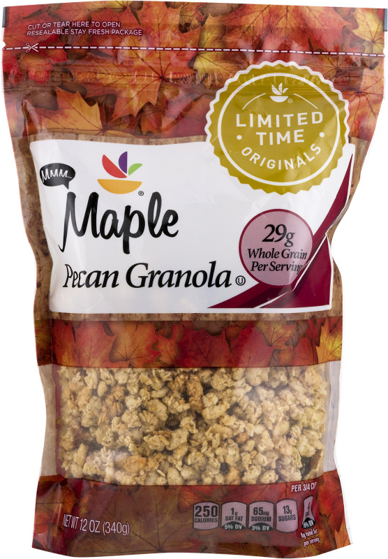 Ahold® Maple Pecan Granola. Limited time originals. Resealable stay fresh package. Mmm.. 29g whole grain per serving. Per 3/4 cup: 250 calories. 1g sat fat, 5% DV. 65mg sodium, 3% DV. 13g sugars. 4g fiber, 16% DV. 8g total fat per serving.