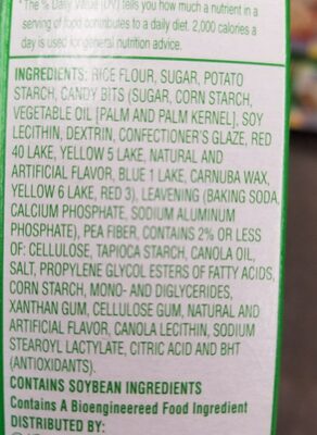 Rice Flour, Sugar, Potato Starch, Candy Bits (Sugar, Corn Starch, Vegetable Oil (Palm and Palm Kernel), Soy Lecithin, Dextrin, Confectioner'S Glaze, Red 40 Lake, Yellow 5 Lake, Natural and Artificial Flavor, Blue 1 Lake, Carnuba Wax, Yellow 6 Lake, Red 3), Leavening (Baking Soda, Calcium Phosphate, Sodium Aluminum Phosphate), Pea Fiber, Contains 2% or Less of: Cellulose, Tapioca Starch, Canola Oil, Salt, Propylene Glycol Esters of Fatty Acids, Corn Starch, Mono - and Diglycerides, Xanthan Gum, Cellulose Gum, Natural and Artificial Flavor, Canola Lecithin, Sodium Stearoyl Lactylate, Citric Acid, BHT.