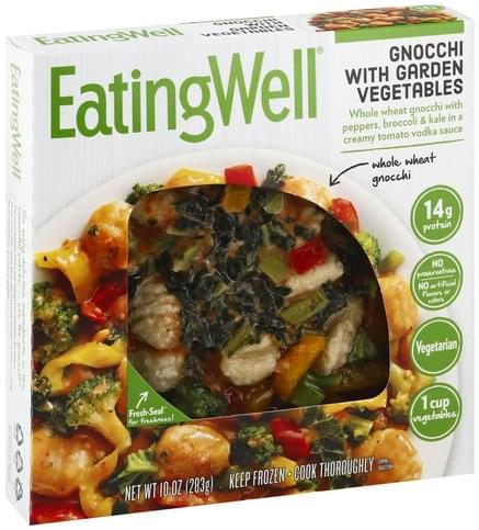 Whole wheat gnocchi with peppers, broccoli & kale in a creamy tomato vodka sauce. No artificial flavors or colors. 14 g protein. Vegetarian. Excellent source of calcium. Whole wheat gnocchi. 1 cup vegetables. You will love our gnocchi with garden vegetables. You'll love our spin on the popular Italian-American vodka sauce with garden fresh kale and the sharp, bright flavor of California-grown tomatoes. So rich and satisfying! EatingWell started out on a county road in Vermont. Our aim was to help you make sense of nutrition and cook delicious food made from simple, nourishing ingredients. Today our goal is the same,re doing the cooking for you! Fresh-seal for freshness! Our cool Fresh-seal technology vacuums in the delicious flavors of this meal. So many delicious ingredients in this beautiful entree - see for yourself! Vacuum sealing locks out oxygen to maintain freshness. Fresh-Seal film material is safe and easy to remove after cooking. Real ingredients, premium quality. EatingWell.com/frozenfresh. Facebook. Twitter. Instagram.