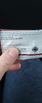 Organic Brown Rice Syrup, Organic Rolled Oats, Soy Protein Isolate, Organic Cane Syrup, Organic Roasted Soybeans, Rice Flour, Cane Sugar, Unsweetened Chocolate++, Cocoa++, Organic Soy Flour, Organic High Oleic Sunflower Oil, Organic Oat Fiber, Alkalized Cocoa, Natural Flavors, Cocoa Butter++, Sea Salt, Barley Malt Extract, Soy Lecithin. Vitamins & Minerals: Dicalcium Phosphate, Magnesium Oxide, Ascorbic Acid (Vit. C). Dl-Alpha Tocopheryl Acetate (Vit. E). Beta Carotene (Vit. a), Niacinamide (Vit. B3), Ergocalciferol (Vit. D2), Thiamine Mononitrate (Vit. B1), Pyridoxine Hydrochloride (Vit. B6), Riboflavin (Vit. B2), Cyanocobalamin (Vit. B12).