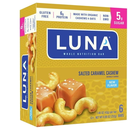 Natural flavor. Gluten free. 6 g protein. Made with organic cashews & oats. Non-GMO. 5 g sugar. New flavor. In 1999, we created Luna, the first nutrition bar for women.