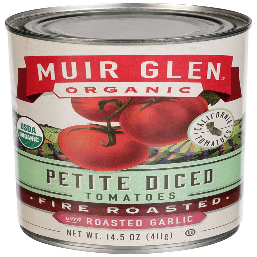 - The manufacturer of Fire Roasted Organic Petite Diced Tomatoes with Roasted Garlic, Fire Roasted is Muir Glen.