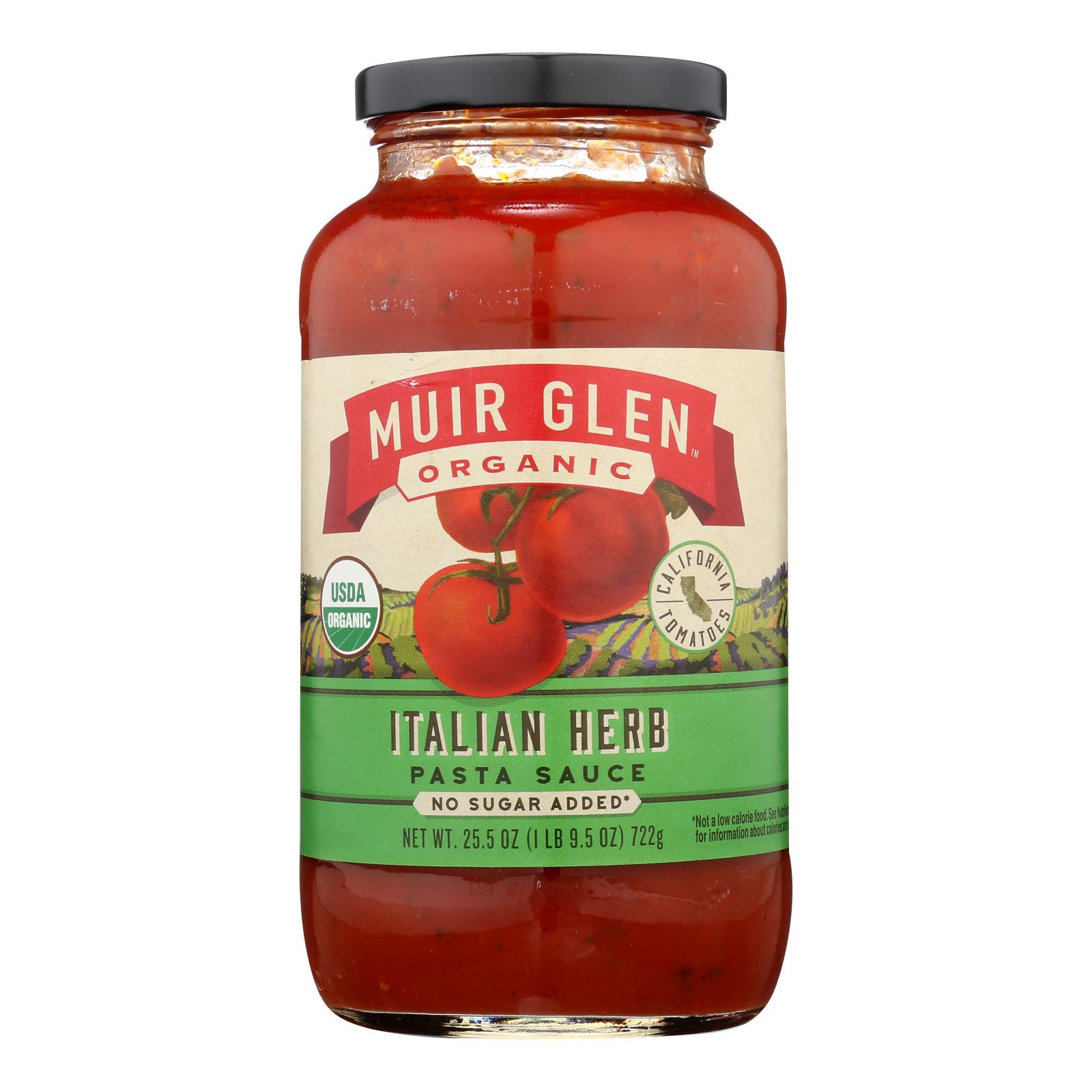 Flavored with nine Italian herbs and spices--and of course, extra-virgin olive oil and Muir Glen Organic tomatoes--this rich and tasty pasta sauce makes dinner delicious, in a snap. USDA Certified Organic. Glass Jar. Our tomatoes bring bright, bold flavor to the table. Tomatoes grown on organic farms, drenched in California sunshine.