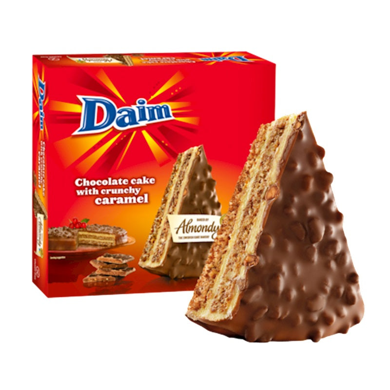 Chocolate cake with crunchy caramel. Gluten free. Product of Sweden. 400g. Almondy Daim Cake is a popular Swedish dessert that consists of a crispy almond base topped with a rich and creamy vanilla filling and covered with pieces of Daim chocolate. Daim is a Swedish brand of chocolate that has a crunchy, brittle texture and a sweet, caramelized flavor. The cake is made with high-quality ingredients, including almonds, butter, sugar, and real cream. It is gluten-free, making it a great option for those with gluten sensitivities or celiac disease. Almondy Daim Cake is a delicious and indulgent dessert that is perfect for any occasion. It can be served on its own as a sweet treat or paired with a scoop of vanilla ice cream for an extra-special dessert. The combination of the crunchy almond base, creamy filling, and sweet pieces of Daim chocolate create a satisfying texture and delicious flavor that is sure to please any sweet tooth.