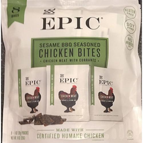 EPIC® Sesame BBQ Seasoned Chicken Bits. Handcrafted. Gluten free. Soy free. Chicken used - No antibiotics added. Chicken meat with currants. Made with 100% natural chicken. Made with Certified Humane chicken. Inspected for Wholesomeness by U.S. Department of Agriculture. 8 - 1 oz (28 g) Pouches. Net Wt. 8 oz (226 g). Epic Bites were created to conveniently feed our inner hunter while staying true to the fundamental principles of consuming wholesome food. As with all Epic foods. the Bites are inspired by the simple yet highly powerful diets of our ancestors. These eating habits have driven human innovation. inspired creativity, and fueled mankind for over 250.000 years of brilliant evolution. Finally, a snack as intended by Mother Nature. Our Currant + Sesame BBQ Chicken Bites are a refreshing and portable snack you will feel good about eating. Our simple yet highly powerful ingredient label hits the palate with semisweet notes of organic currants and further develops into a spicy medley of Asian-Style spices. This artfully crafted Epic snack is tailored to the foodie carnivore who refuses to settle. As with all Epic Products, our Bites are inspired by the founding principle of our company: "Feed others as you wish to be fed®." 8g of Protein per serving. Chicken used: 100% Natural*. No antibiotics added. No growth stimulants**. *Minimally processed. No artificial ingredients. **Federal regulations prohibit the use of growth stimulants in chicken. Questions. Comments. Concerns: Call: (512) 993-4774. Visit: www.epicbar.com.