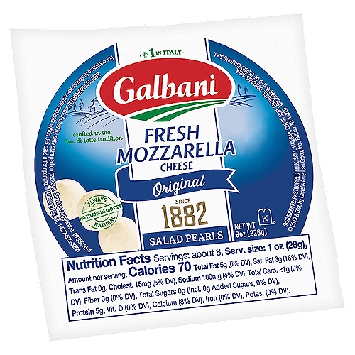Galbani Fresh Mozzarella 8oz Pearls Traditional bite-size fresh mozzarella pieces are ideal for slicing or dicing in salads and other dishes, and offer a delicate taste and smooth texture.