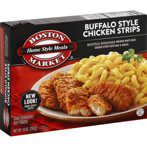 Buffalo seasoned breaded white meat chicken strips with mac & cheese. New look! Same great taste! Inspected for wholesomeness by US Department of Agriculture. The beautiful foods company. We'd love to hear from you! Call us at 1-855-871-9977 (M-F) or visit wwww.BostonMarketatHome.com.