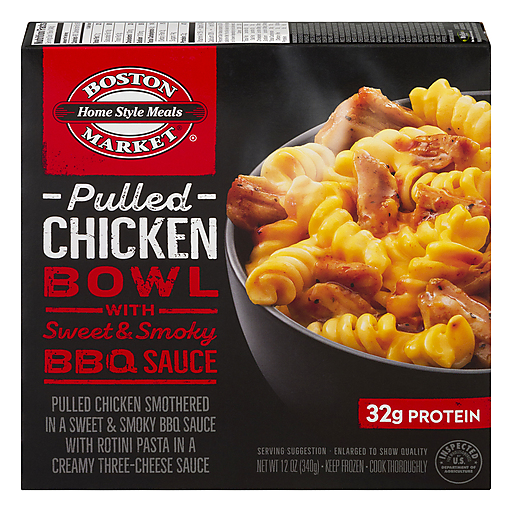 Pulled chicken smothered in a sweet & smoky BBQ sauce with rotini pasta in a creamy three-cheese sauce. 32 g protein. Home style meals. Boston Market.