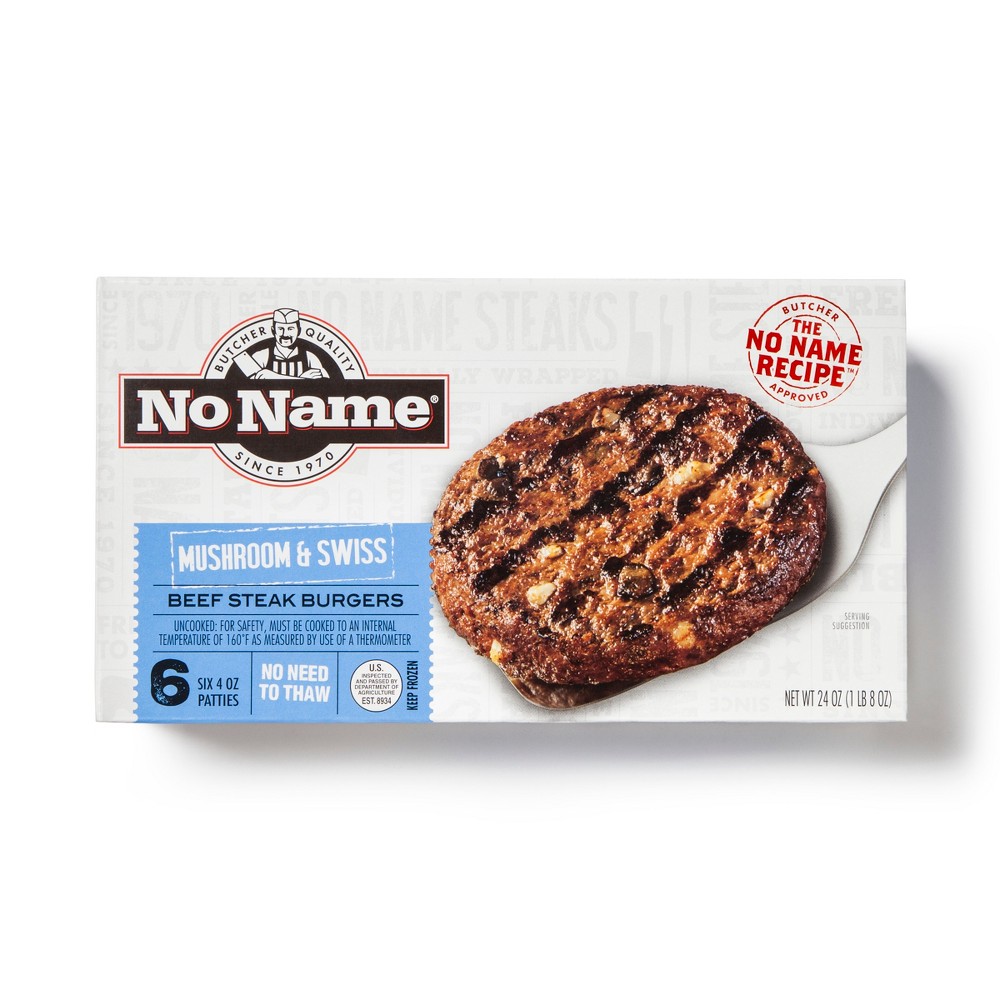 - The manufacturer of Mushroom & Swiss Beef Steak Burgers, Mushroom & Swiss is No Name.