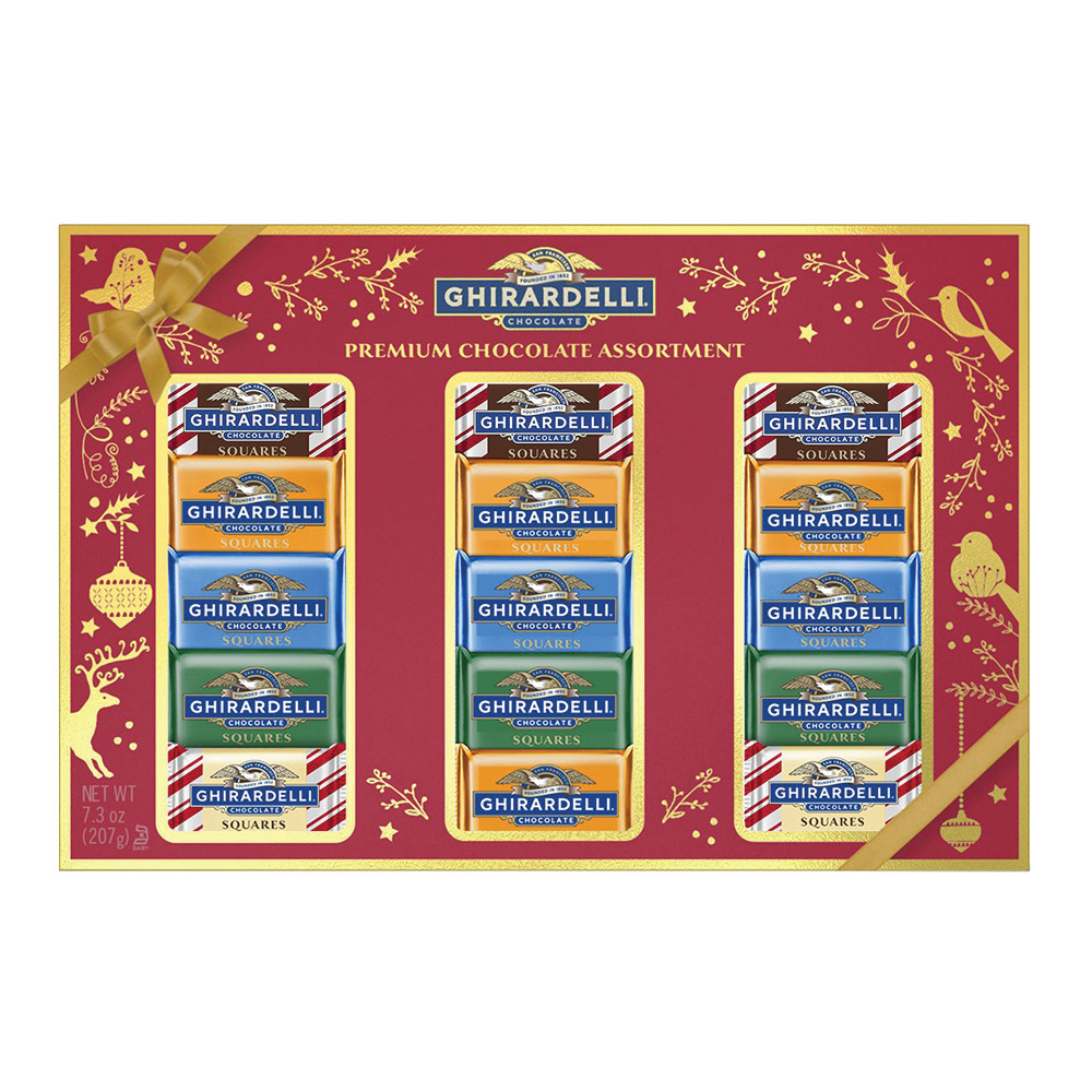 These festive Ghirardelli chocolates are perfect for your candy dish and sharing with friends and family Ghirardelli squares chocolates deliver the perfect balance of intense, slow-melting Ghirardelli chocolate and luscious fillings We hand-select the world's finest cocoa beans to create our proprietary bean blend and roast them to perfection, then we slow-blend in the purest ingredients to achieve our award-winning distinctively intense chocolate. Includes milk chocolate and carmel squares, peppermint bark squares, dark chocolate sea salt and carmel squares, mint dark chocolate squares, carmel dark chocolate squares.