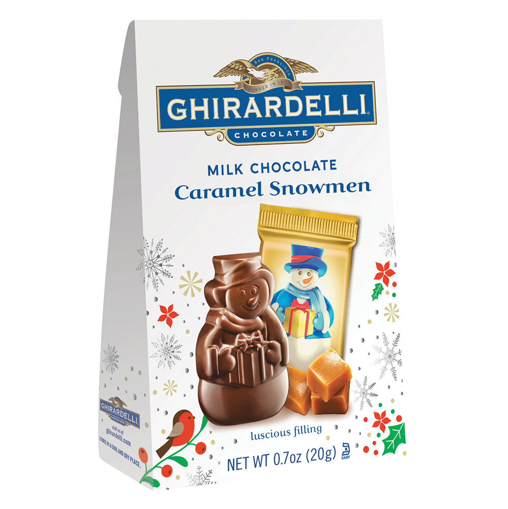 New. Luscious filling. Celebrate the holidays with Ghirardelli creamy milk chocolate snowmen filled with luscious caramel. This is the perfect gift or stocking stuffer for children and children at heart. Discover the Ghirardelli difference. Select high quality beans. Roast nibs for intensity. Refine for smoothness. Conche for flavor. We control all steps for ultimate quality. Ghirardelli of San Francisco since 1852. Ghirardelli.com. For more information about our ingredients and sustainable sourcing visit Ghirardelli.com.