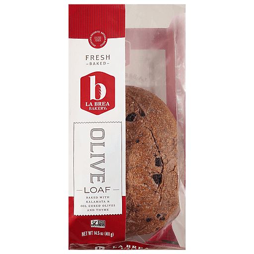 Non GMO Project verified. nongmoproject.org. www.LaBreaBakery.com. Whole, juicy Kalamata Olives, oil-cured olives and thyme create a rich, hearty and satisfying loaf. From starter to finish, it takes over 24 hours to make a loaf of La Brea Bakery bread. It isn't the easiest way, but with patience and care come deep and complex flavors. Our commitment to simple, high-quality ingredients, long proofing times, and our original starter hasn't changed since we baked our first loaf on La Brea Avenue back in 1989. Estd 1989. Facebook/labreabakery. Twitter(at)labreabakery. Instagram(at)labreabakery.