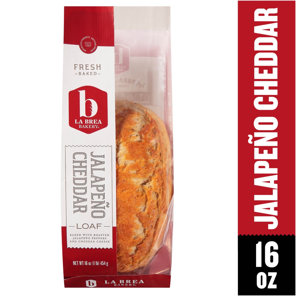 La Brea Bakery Loaf Loaf Jalapeno-and-Cheddar loaf 0 g trans fat Contains milk and wheat Made in facilities that also process eggs, soy, and tree nuts Keep frozen for later use 16 oz. (453.59 g) each 12 loaves per case The La Brea Bakery Jalapeno Cheddar Loaf is a delicious mix of spicy jalapenos and rich cheddar chees.