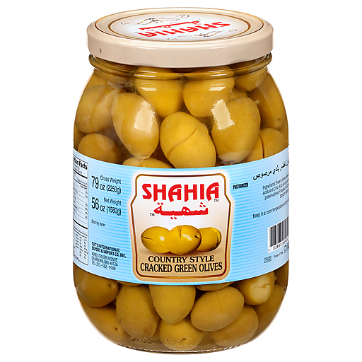 - The manufacturer of Country Style Cracked Green Olives is Shahia.