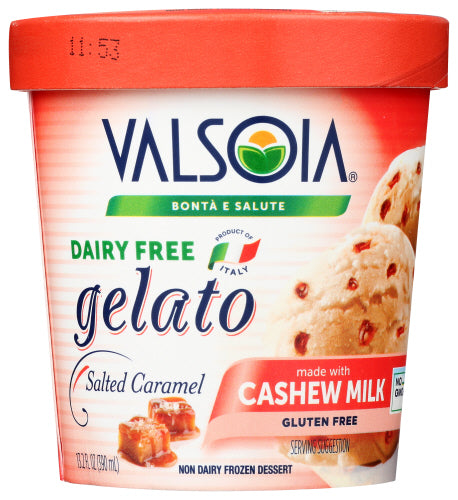 Non dairy frozen dessert. Made with cashew milk. Gluten free. No-GMOs. A true Italian indulgence ready to take you away. Any Italian will tell you that a great gelato is a marriage of rich, sumptuous flavor and a light, creamy texture. One taste is all it takes to whisk you away to another place. At Valsoia, we promise you all this and more! The dairy-free alternative gelato lovers have been waiting for! In the tradition of Italy's master gelato makes, we transform carefully sourced, non-GMO ingredients into a smooth, decadent and delightful indulgence that proves Italy is only a taste away. Cashew non dairy frozen dessert with salted caramel flavor and caramel flakes. If you have suggestions about Valsoia, write to us. Product of Italy.