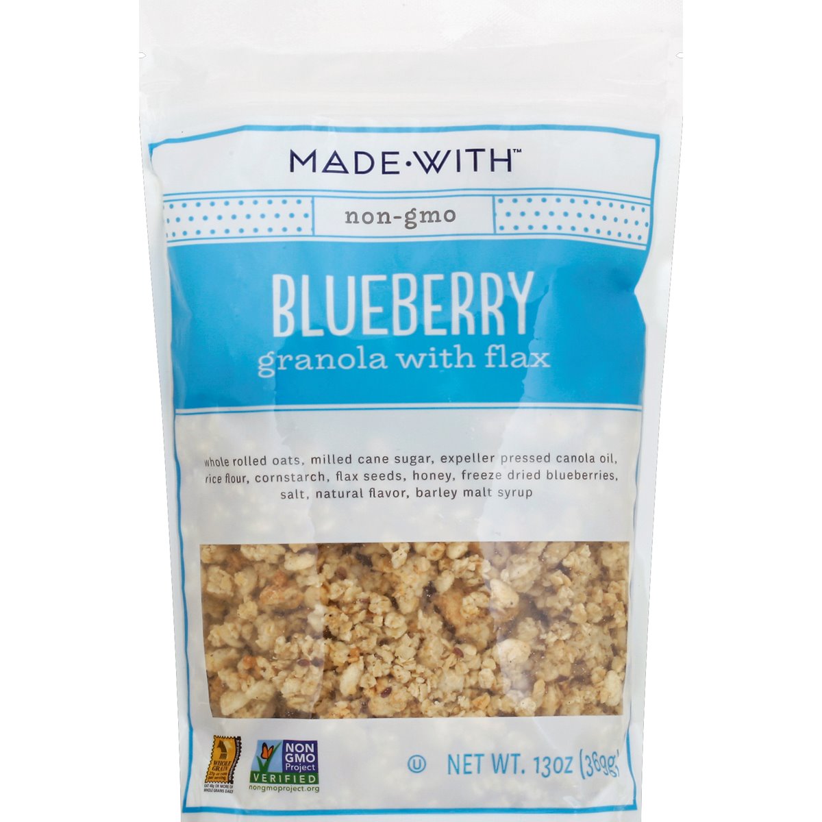 Made With Blueberry Granola with flax is made with blueberries, flax, and rolled oats. Each serving contains 8 g. Of total fat, 14 g. Of sugar and 4 g. Of healthy protein. Our granola tastes great when eaten on its own or with milk and can also be used as a topping for ice cream, yogurt, and chopped fruit. This 13 oz. bag provides approximately seven servings.
