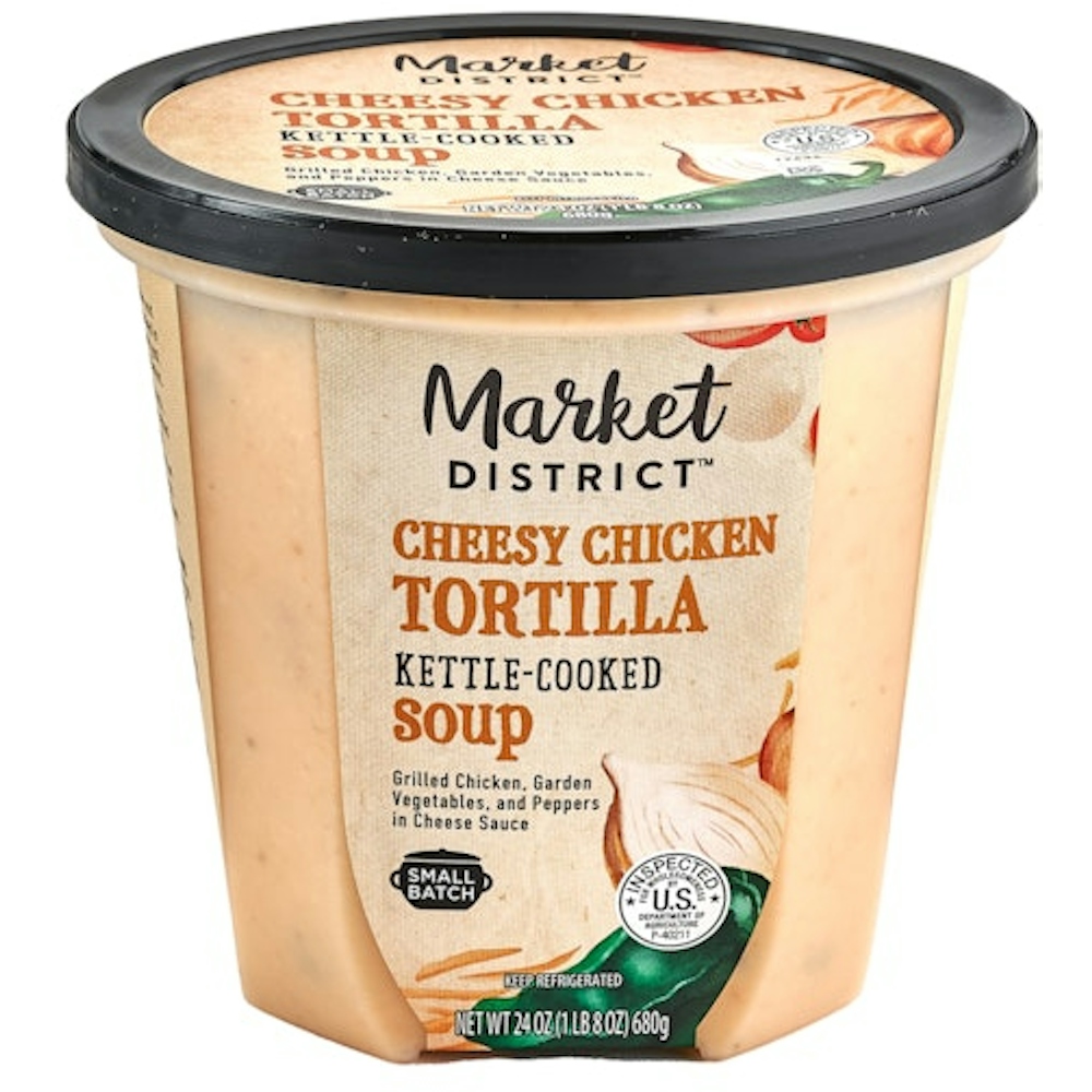 - The manufacturer of Cheesy Chicken Tortilla Soup is Market District.