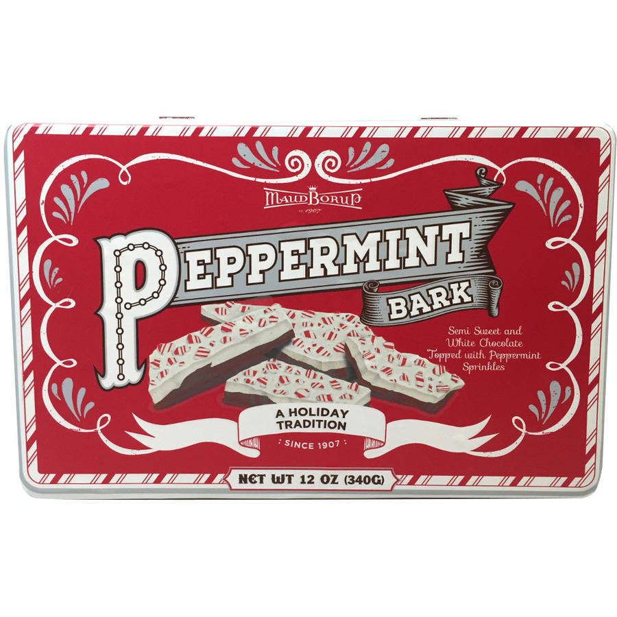 Treat yourself to Maud Borup Peppermint Bark Candy, 12 oz. It is a popular holiday snack that features white chocolate topped with colorful sprinkles. This peppermint candy comes in a charming tin container.
