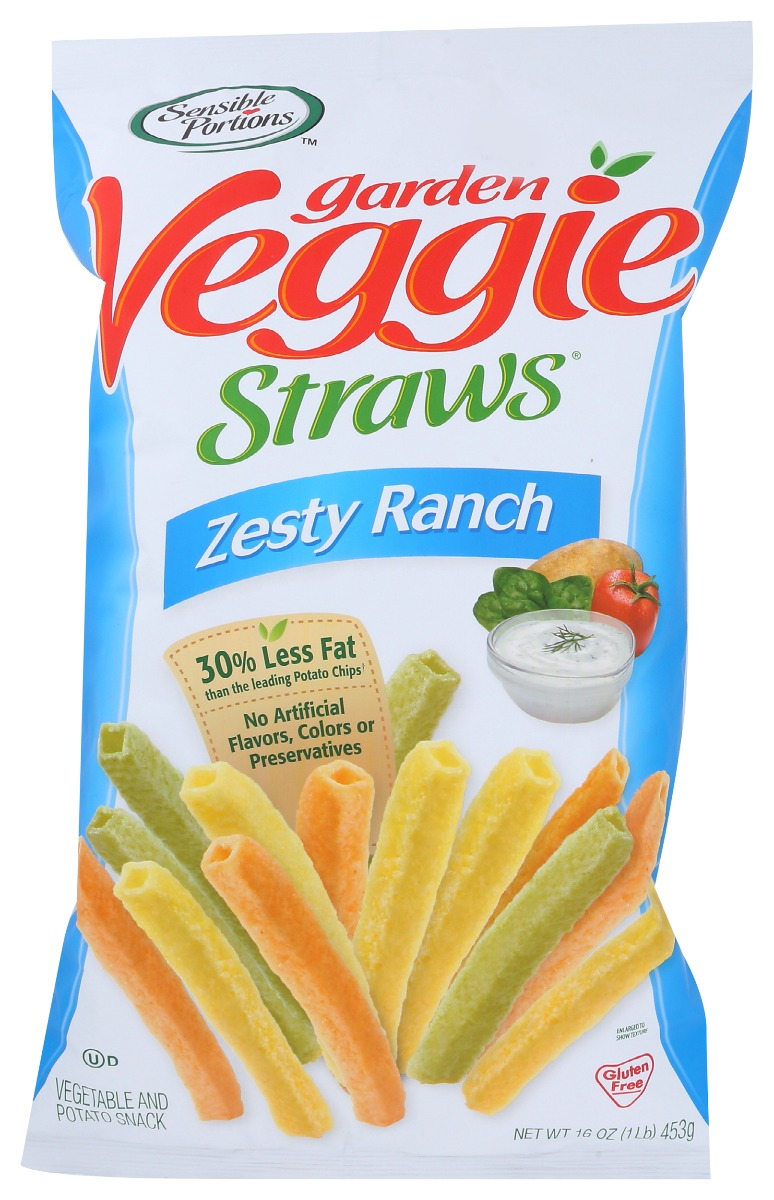 Straws Zesty RanchSensible Portions™ Zesty Ranch Garden Veggie Straws®. Combination of garden grown potatoes, ripe vegetables, and 30% less fat than the leading potato chip† provides a better-for-you snack. These tempting snacks also come in other varieties such as garden Veggies Straws® sea salt, apple Straws™ cinnamon, and garden Veggie Straws® zesty ranch or garden veggie Chips™ zesty ranch. No added artificial flavors or preservatives, gluten, GMO, fat.