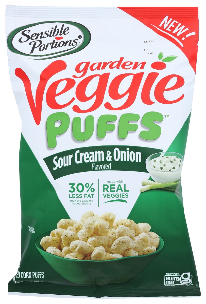 Made with real veggies! Sensible Portions Garden Veggie Puffs are an airy and poppable snack that are sure to please your entire family, even the kids at heart. They are baked, never fried, made with real vegetables, and have no artificial ingredients. Sour cream & onion flavored, when you get all of this, plus amazing taste of sour cream & onion, it makes for one satisfying snack of sensible portions.