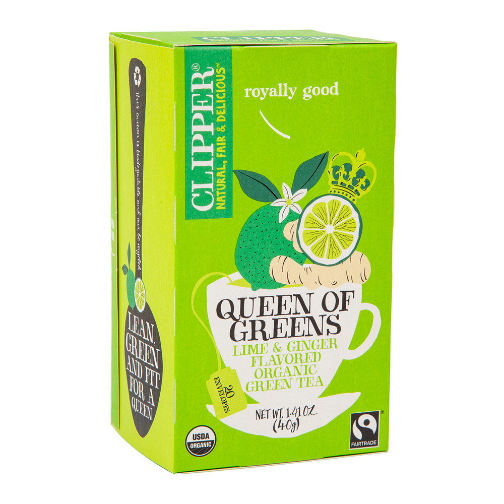 Lime and ginger green tea Organic, Non-GMO, Fairtrade, gluten-free Colorful packaging gets noticed. Make customers the envy of their friends and family by stocking the queen of green teas - Clipper Tea Queen of Greens. Green tea gets an extra zing from a blend of lime and ginger. There's more to be jealous of - Clipper teas are Non-GMO, Fair Trade and packed in unbleached, plastic free tea bags which will appeal to health conscious customers. A vibrant green box with a crown and tea cup adds whimsy to your tea section.