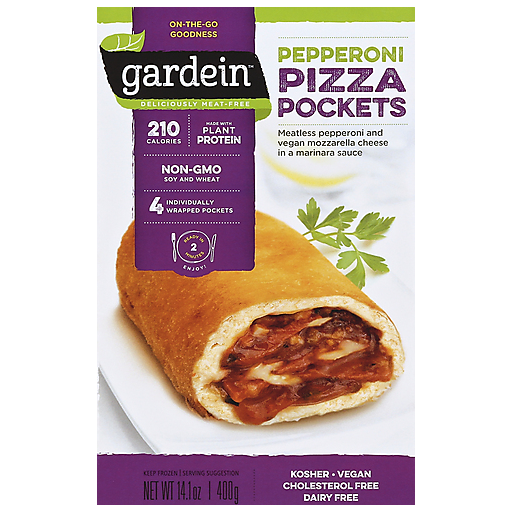 Meatless pepperoni and vegan mozzarella cheese in a marinara sauce. On-the-go goodness. Deliciously meat-free. 210 calories. Made with plant protein. Non-GMO soy and wheat. Individually wrapped pockets. Ready in 2 minutes. Enjoy! Kosher. Vegan. Cholesterol free. Dairy free. Certified vegan. Non-GMO soy, wheat, corn and canola.