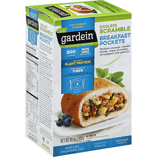 Meatless sausage, chedd'r shreds, vegan scramble, red peppers and spinach. Good morning goodness. Deliciously meat-free. 200 calories per pocket. Non GMO soy & wheat. Made with plant protein. Good source of fiber. Contains 7 g of total fat per serving. See nutrition information for fat and sodium content. Ready in 3 minutes. Enjoy! Dairy free. Cholesterol free per serving. Certified vegan. Kosher.