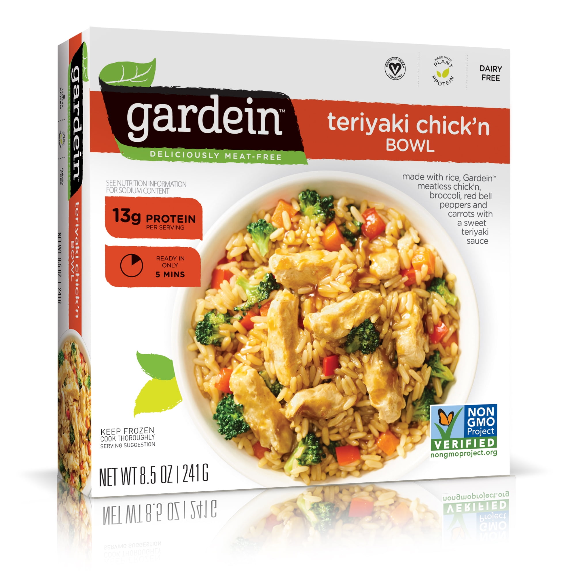 Made with rice, Gardein meatless chick'n broccoli, red bell peppersa and carrots with a sweet teriyaki sauce. Made with plant protein. Certified vegan. vegan.org. Dairy free. 13 g protein per serving. See nutrition information for sodium content. Non GMO Project verified. nongmoproject.org. Ready in only 5 mins. Deliciously meat-free. Enjoy our convenient single serve bowls that bring you a delicious, complete meal! Gardein Bowls are a tasty meat-free combination of crisp vegetables, grains or pasta in flavorful sauces. Facebook. Twitter. Pinterest. Instagram. Get social with us. Recipes at www.gardein.com. how2recycle.info.