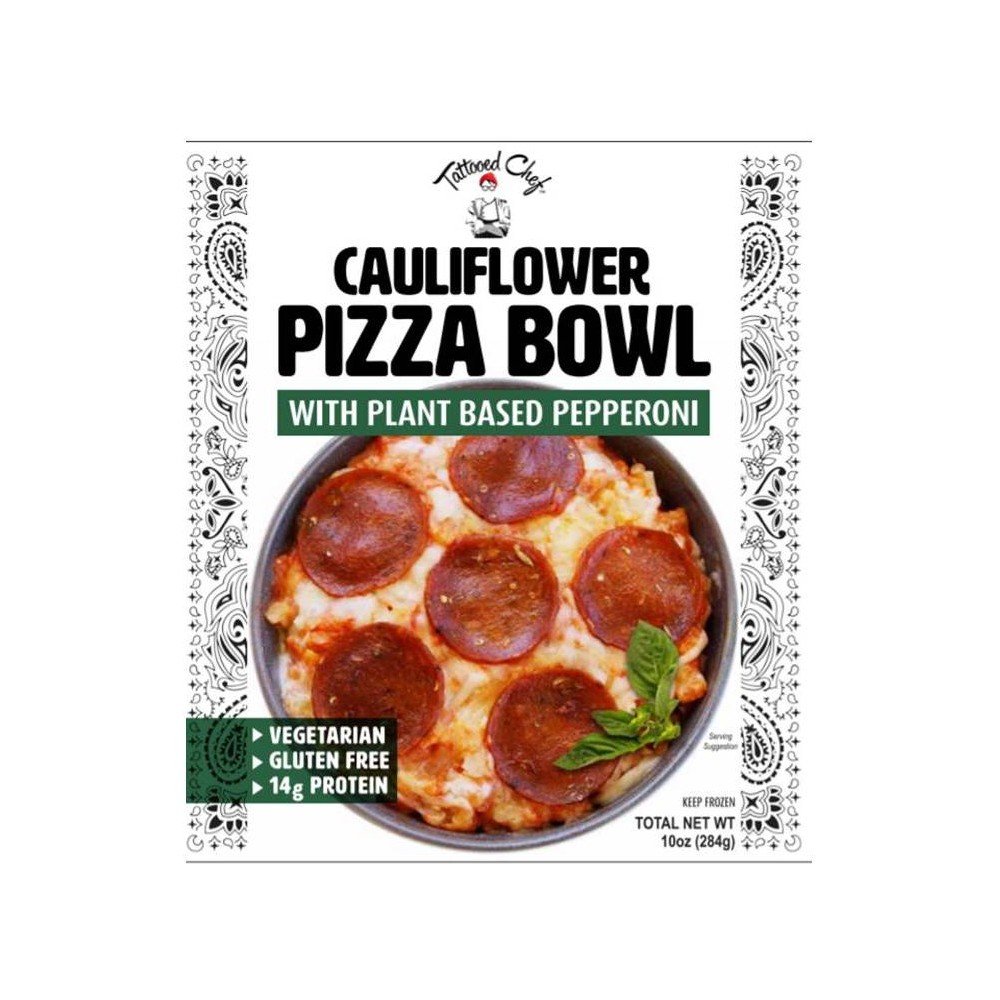 Pizza sauce over cauliflower florets, topped with plant based pepperoni and a blend of mozzarella and provolone cheeses. At Tattooed Chef, we do things differently, and we do that on purpose. Our approach to flavor and innovation paired with a focus on quality and sustainable ingredients delivers a range of delicious plant based foods. We do farm to table our own way. Italian grown; L.A. made.