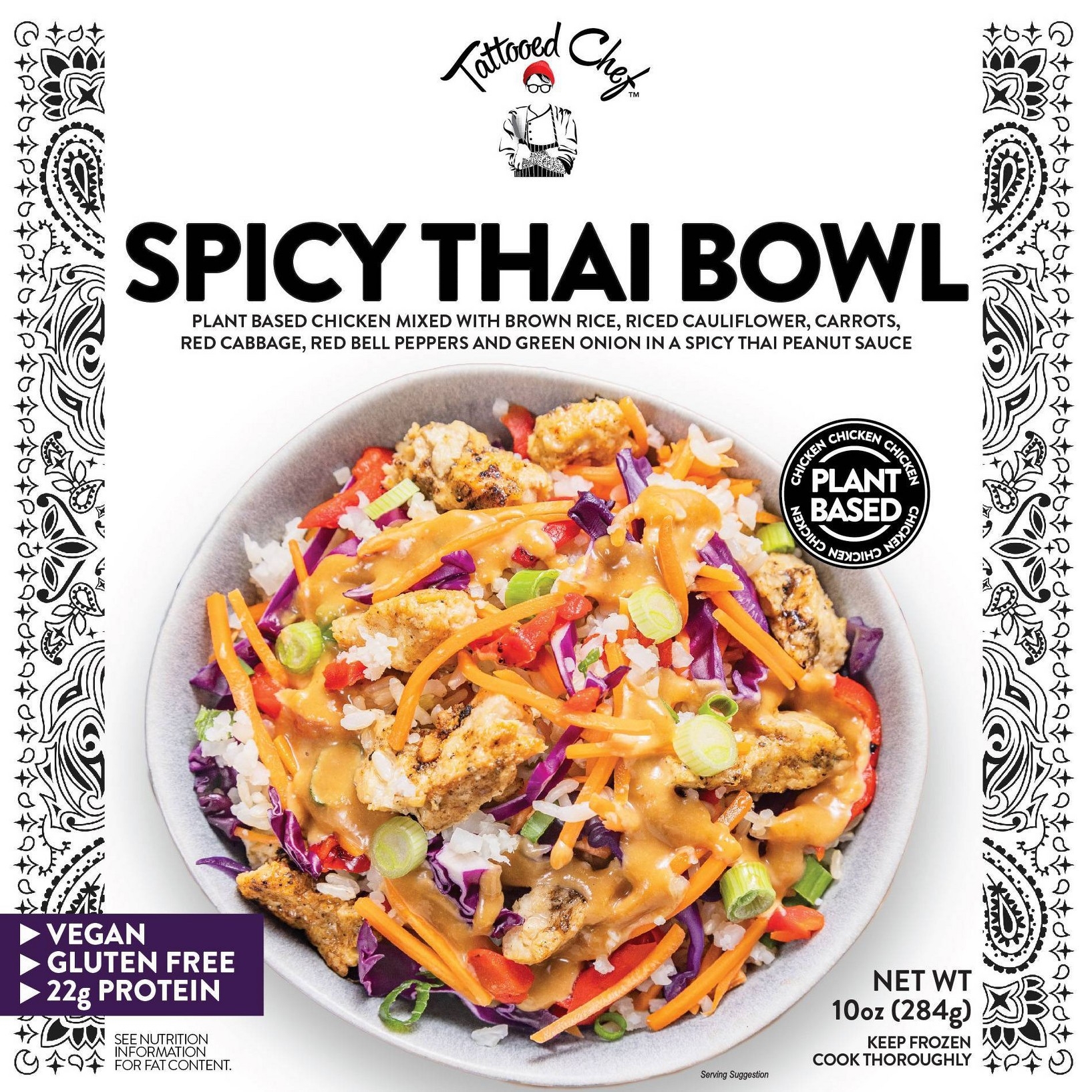 Plant based chicken mixed with brown rice, riced cauliflower, carrots, red cabbage, red bell peppers and green onion in a spicy Thai peanut sauce. 22 g protein. Vegan. Gluten Free See nutrition information for fat content. Growing + making plant-based foods for people who give a crop. www.tattooedchef.com. Facebook. Spotify. Instagram. Twitter (at)tattoedcheffoods. Check out our other plant-powered foods at tattooedchef.com.