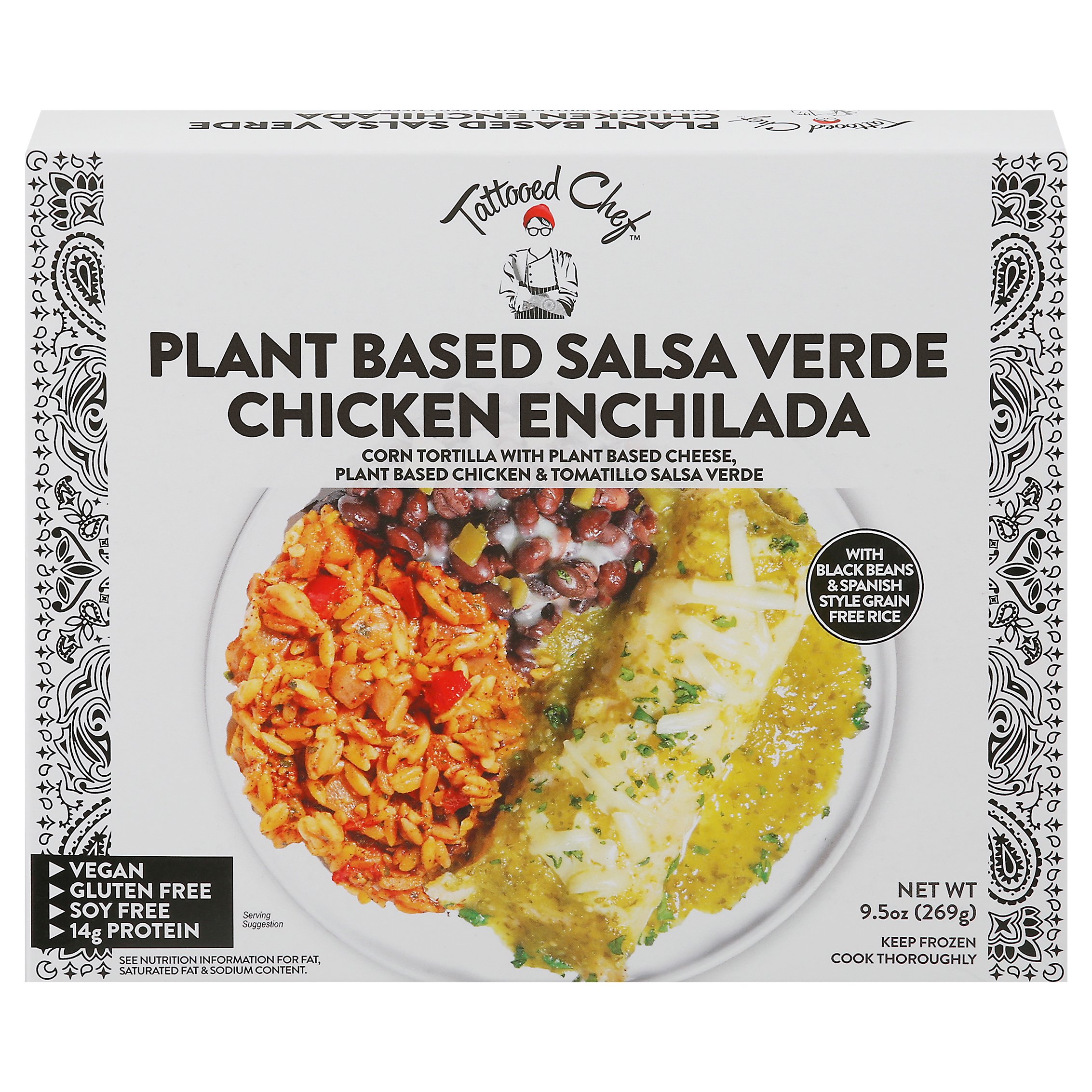 Tattooed Chef creates delicious plant based food for a community who wants more plants with less prep. We slice. We rice. We serve up classic dishes and new obsessions โ all with a Tattooed Chef twist. So you can just eat and chill. Our Plant Based Salsa Verde Chicken Enchilada uses the best-tasting plant based chicken for a savory enchilada topped with our vegan jack and tangy salsa verde. Accompanied by Spanish style chickpea and lentil rice and green chili flavored black beans.