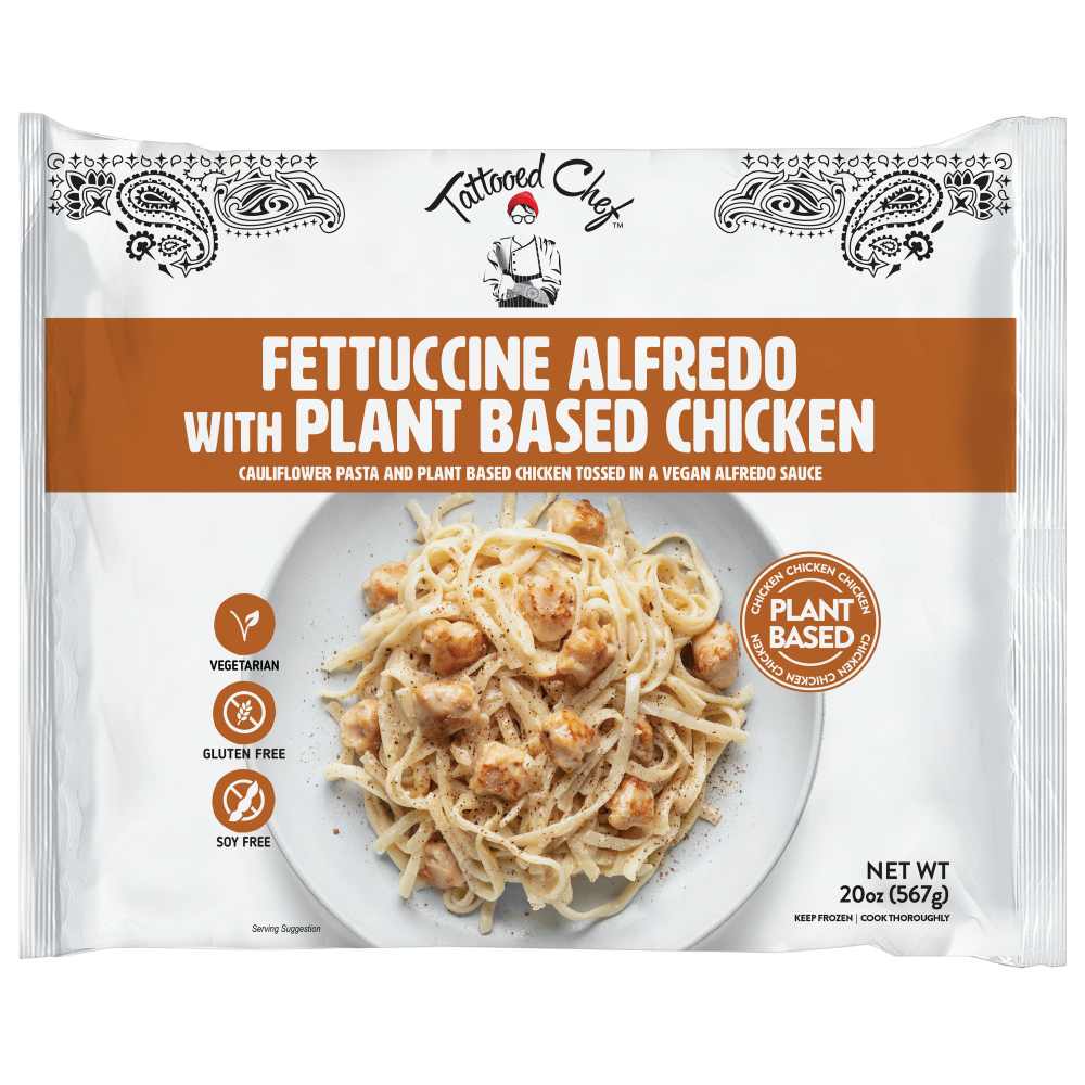 - The manufacturer of Fettuccine Alfredo with Plant Based Chicken Cauliflower Pasta and Plant Based Chicken Tossed in a is Tattooed Chef.