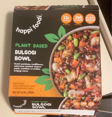 Bulgogi Sauce (Water, Sugar, Maltodextrin, Toasted Sesame Seeds, Onions, Food Starch-Modified, Soy Sauce (Soybean, Wheat, Salti, Granulated Garlic, Sesame Oil, Red Miso (Fermented Soybeans and Salti, Spices, Salt, Molasses Powder. Less Than 2% Natural Flavors, White Distilled Vinegar, Wheat Starch, Soy Flour, Canola Oil, Xanthan Gum, Silicon Dioxide [Anti Caking Agent)), Sweet Potatoes, Cauliflower, Edamame, Meatless Crumble (Water, Soy Protein Concentrate, Expeller Pressed Canola Oil, White Distilled Vinegar, Caramel Color, Yeast Extract, Sea Salt, Natural Flavor [Yeast Extract, Onion, Garlic, Green Cabbage, Mushroom, Black Pepper, Gingeri, Xanthan Gum), Carrots, Green Onions.