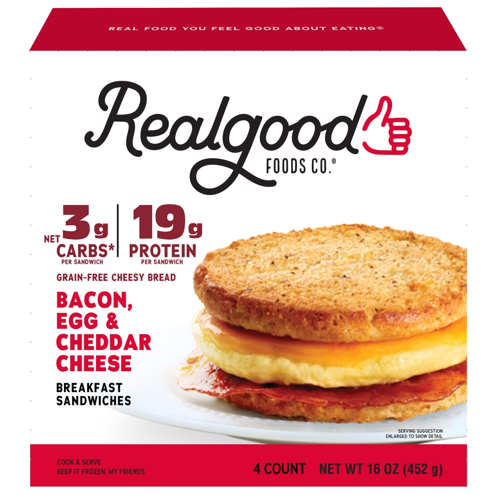 - The manufacturer of 4 Bacon, Egg & Cheddar Cheese on a Cauliflower Cheesy Bread Breakfast Sandwiches, 4 Bacon, Egg & is Realgood Foods Co..