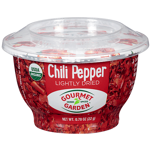 USDA Organic. Certified Organic by Australian Certified Organic. Herbs spices. Contains 5 roughly chopped organic chili peppers, lightly dried (just enough) to last for 4 weeks once opened. Refreshes in cooking. Product is sold by weight and volume, setting may occur. gourmetgarden.com. For everything about herbs gourmetgarden.com. Remove sleeve to reuse or recycle. Made in Australia.