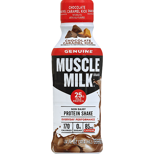 - The product category for Muscle Milk, Genuine Non Dairy Protein Shake, Chocolate Caramel Kick, Chocolate Caramel Kick is Beverages.
